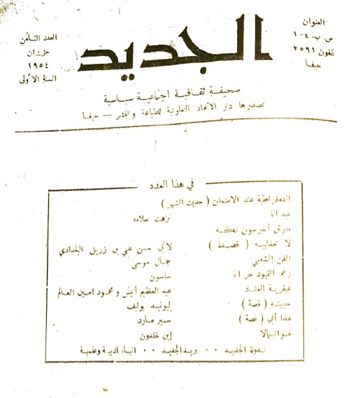 Table of contents of the literary journal al-Jadid: A Cultural, Social and Political Magazine, 2/1 (1954).