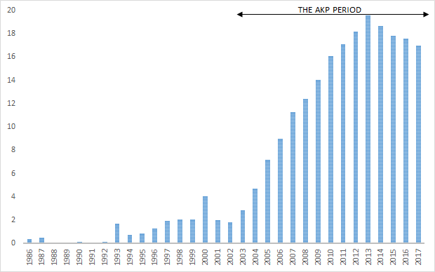 Under such financial strain, millions of Turkish people now depend on direct monetary or in-kind aid by the government as well as on the availability of consumer loans and credit cards for their livelihood. For over a decade, the AKP has distributed such aid and free services to their low-income followers through local governments and municipalities under their control. In addition, since the AKP came to power in 2002, Turkey experienced a rapid accumulation of household debt, which made up almost 20 percent of GDP in 2013 (see Figure 2).