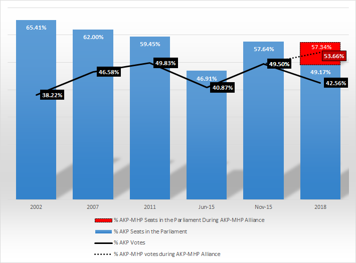 Despite the partial restoration of the AKP’s electoral strength, however, there was no return to normalcy from the war-like state-of-emergency conditions, full-fledged oppression of political opposition and growing authoritarianism. The AKP never fully recovered its electoral strength either. It managed to gain an absolute majority of votes and seats in the parliament only with the help of its ultranationalist ally, thus becoming partially dependent on the MHP.
