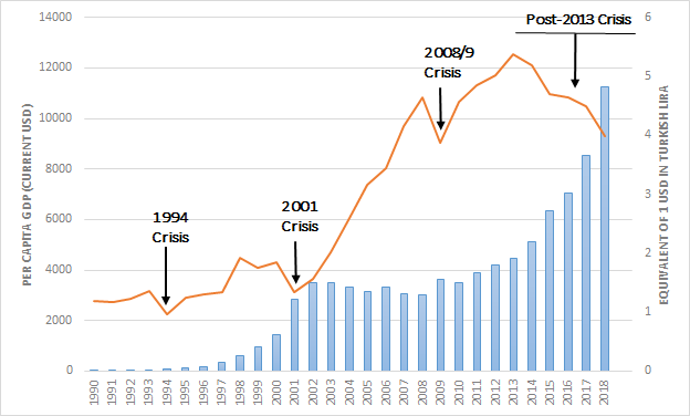 Both Erdoğan and President Donald Trump maintain that Turkey’s economic difficulties emerged in August 2018 after Trump doubled US tariffs on steel and aluminum to pressure Erdoğan into releasing the evangelical pastor Andrew Brunson, which put downward pressure on the Turkish lira. But the Turkish lira had been losing its value against the US dollar since 2008, and even more rapidly since 2013 (see Figure 1). Hence, the causal relationship is the other way around: Because the Turkish economy had been confronting deep structural problems since 2013, it has become extremely vulnerable to external “manipulations.”