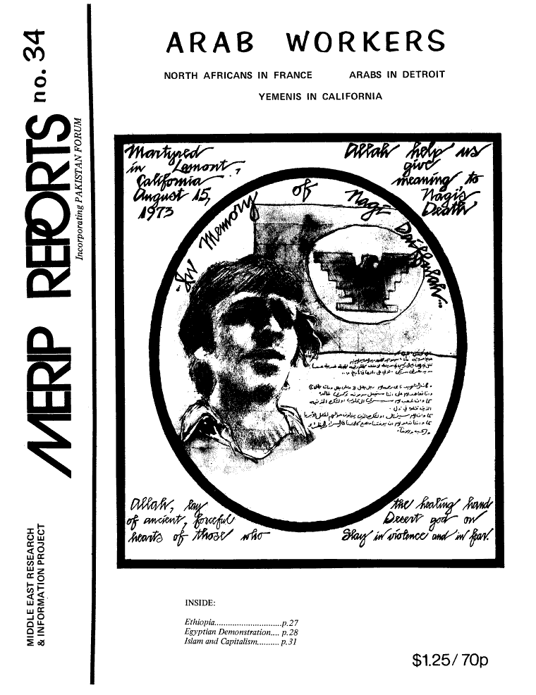 MERIP’s new, broad approach to labor in that period was exemplified by the attention given to migrant, women and agricultural workers. The January 1975 issue, for instance, was devoted to migrant workers from the Maghreb in France and Arab workers in Detroit and California, portending the debates on transnationalism, multiculturalism and racism that erupted in full force a decade later. Articles in this period combined a sensitivity to gender and the long-term processes of class formation, such as one that examined the position of women in the Egyptian working class and another that looked at the proletarianization of Palestinian women in Israel.