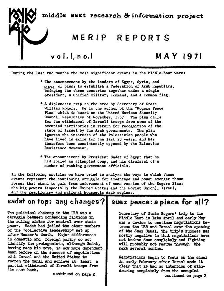I was among a small group of activists who started the Middle East Research and Information Project (MERIP) in early 1971 and was chief editor of its monthly flagship publication, MERIP Reports (later Middle East Report) until 1995. Some of us had served in the Peace Corps or other volunteer organizations in the Middle East in the mid 1960s and had come together as an informal “Middle East caucus” in the Committee of Returned Volunteers, an anti-Vietnam War group.