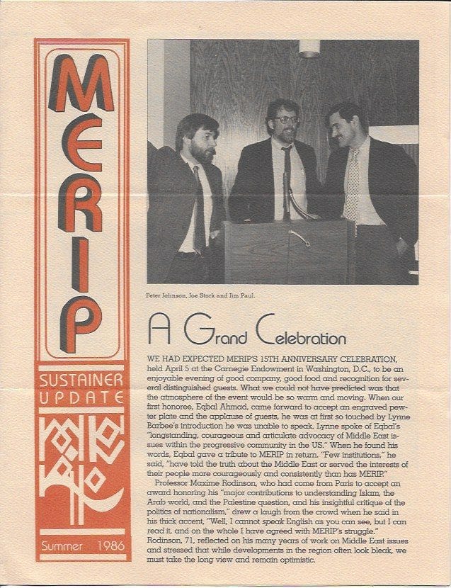 The bottom line is that five decades is one hell of a run. I will close with some more words from Sharon Rose: “MERIP’s goal should be to become an indispensable source of the truth for diverse activist organizations and individuals. That goal was achieved and has been maintained and I send my admiration and love to all those who have contributed so much over these 50 years.”