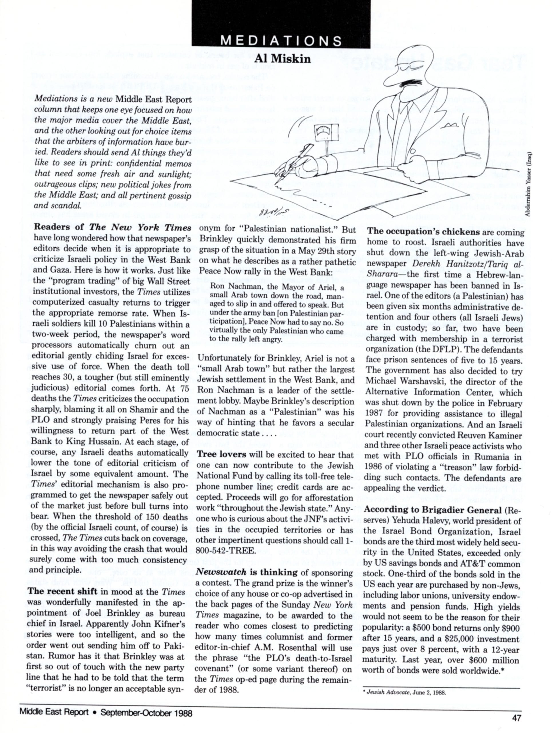 The first Mediations column appeared in 1988 with an introduction that described it as “keep[ing] one eye focused on how the major media cover the Middle East, and the other looking out for choice items that the arbiters of information have buried.” Given the times, with the first Palestinian Intifada raging, it is no surprise that this initial column was focused entirely on Palestine and Israel. The lead item went for grim humor by suggesting that readers could understand “how [the New York Times’] editors decide when it is appropriate to criticize Israeli policy in the West Bank and Gaza”—basically, by counting how many Palestinian protestors the Israelis had killed thus far. The Times, its often clueless correspondents and its rabidly pro-Israel columnist (and former executive editor) A. M. Rosenthal, would be frequent targets of Al Miskin’s invective in the years that followed.