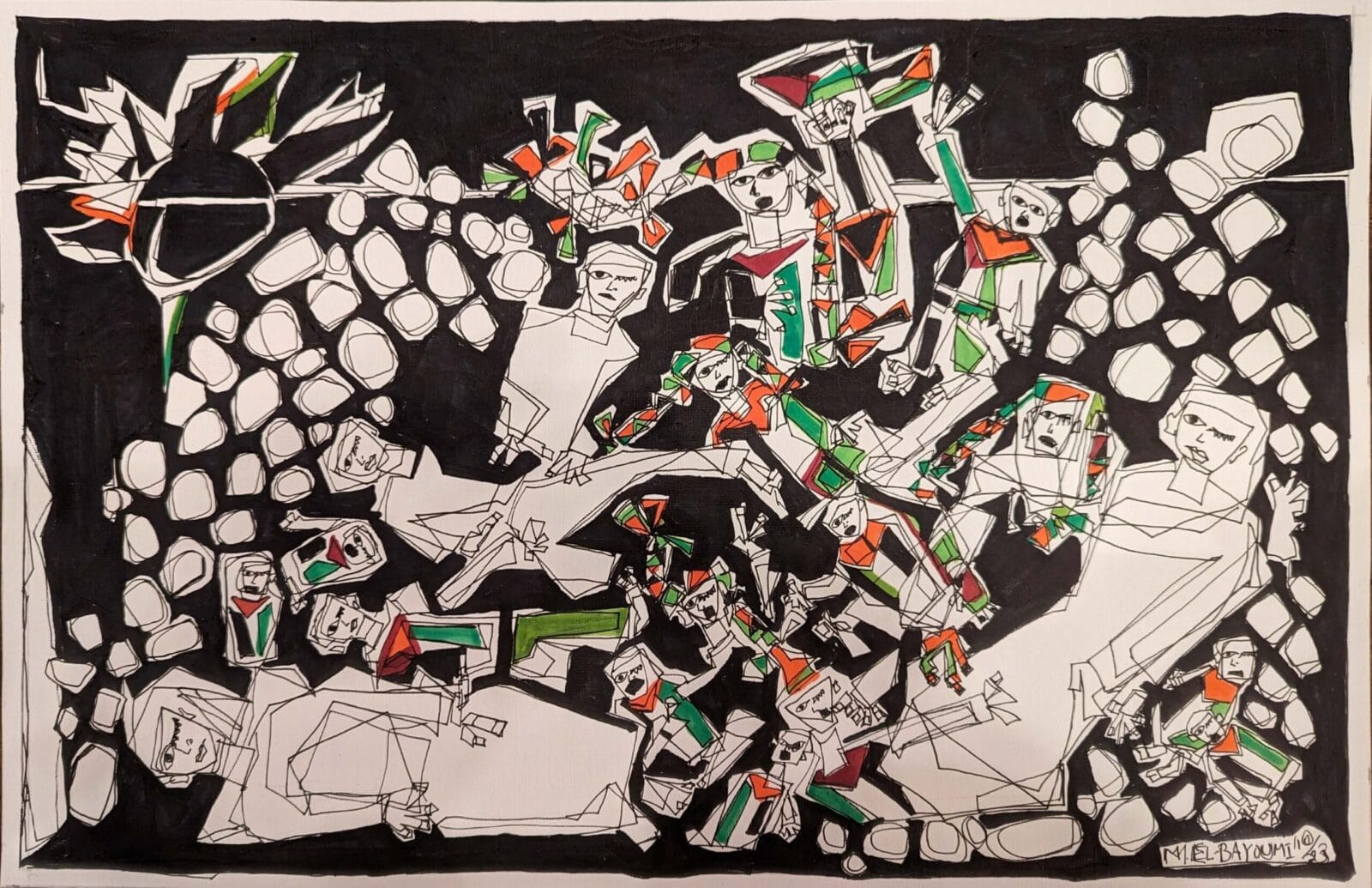El-Bayoumi, who drew the image in October of 2023, wrote that the work is equal parts memorialization and a call to action. This framing fits with the perspective of many of our contributors, Palestinian activists and others who are struggling to bear witness and build in the face of ongoing destruction. El-Bayoumi noted, for example, the prominence of children in the image, holding Palestinian flags and rising to the surface. “This is a piece to give respect for those ‘Under the Rubble’—but, just as importantly, to represent the struggle for a Free Palestine will go on.”