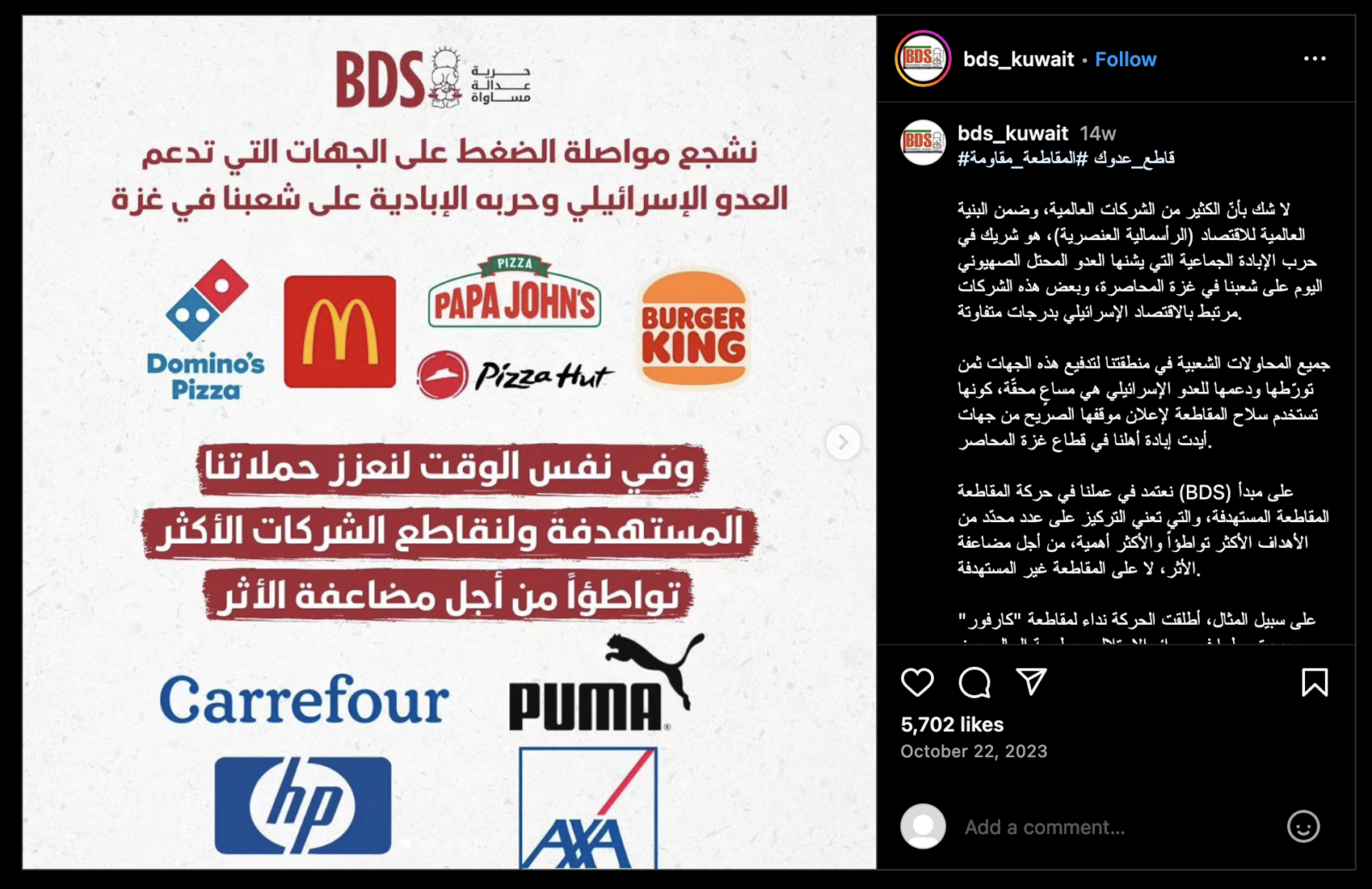 In today’s post-2011 and post-Abraham Accords Gulf, popular measures against Israel’s war in Gaza and its mounting violence across historic Palestine have centered largely around boycott. Anti-normalization groups in Bahrain and groups affiliated with the Boycott, Divestment, Sanctions (BDS) movement in Kuwait, Qatar and the Gulf in general have galvanized campaigns to boycott companies that support Israel or that profit from Palestinian oppression. Today’s popular boycotts include the targeted boycotts proposed by the BDS movement but extend beyond them. Households are changing their grocery purchases and suppliers. Information is being circulated across social media about companies that have established ties to Israel, following the 2021 normalization deals signed by Bahrain and the UAE. The website bdnaash allows users to type company names into a search engine to find out whether they are on the boycott list (the box turns red) or not (the box turns green).
