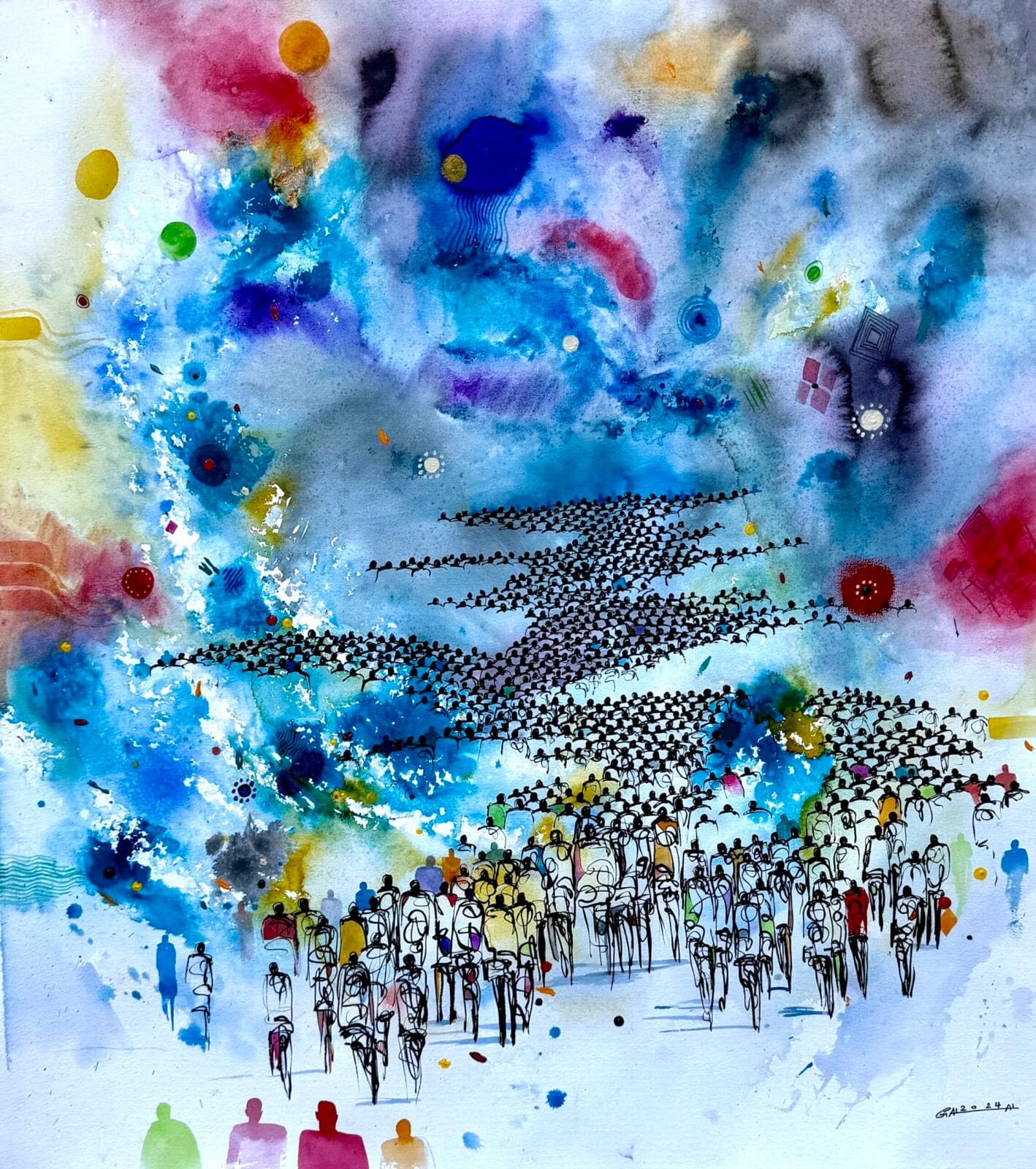 Yousif’s vivid drawing of a multitude of individuals walking away as one group that disappears into the horizon reflects the scale of the crisis and its human dimension. He explained to MERIP that he felt compelled to create this series to raise awareness about what is happening in Sudan. On his Instagram page, where he displays his artwork, he writes, “People have lost so much...These are not only numbers, they are people, they have #life to live, they deserve a better life.”