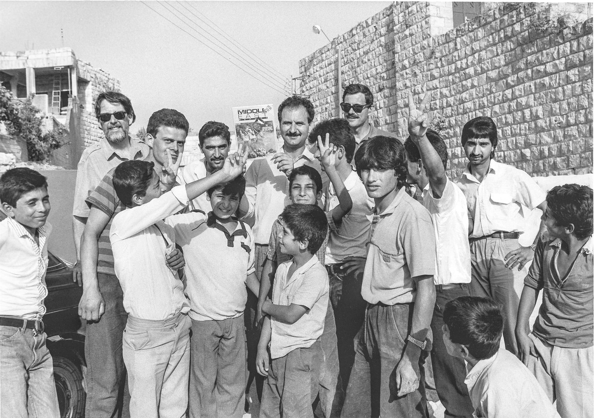 Joe Stork (L), Beshara Doumani (holding MER) and Jim Paul (top right) visiting Beita village in June 1988. The cover image of issue number 152, held up by Doumani, was taken in Beita earlier in the year. Photo by Rick Reinhard.