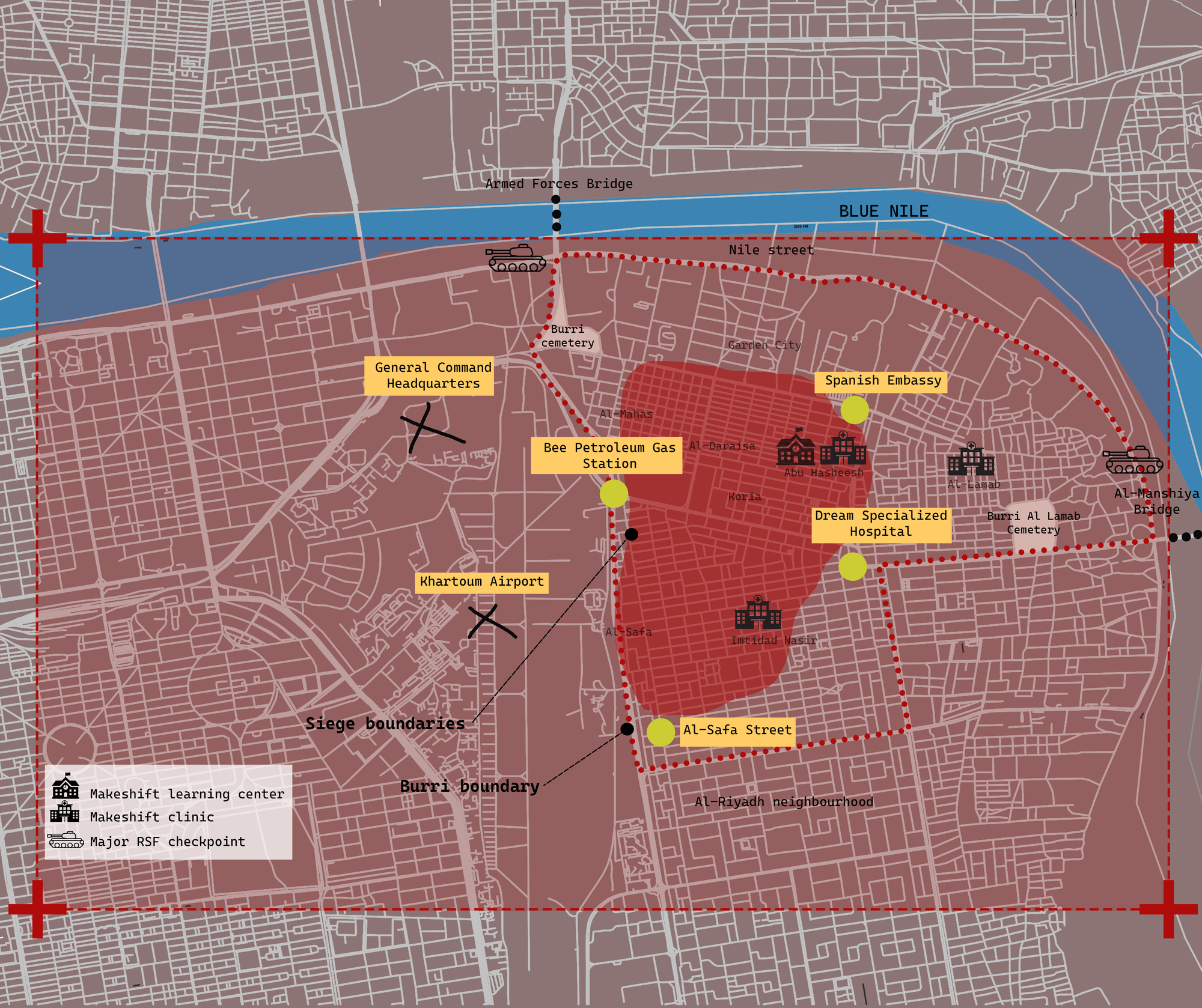 The movement of people and goods was restricted and controlled internally through an extensive network of RSF checkpoints. The new rules imposed by the RSF not only limited mobility but also redrew Burri’s internal boundaries. Residents who left their homes did so at the risk of harassment or assault, and those who had to be in the streets avoided carrying phones and cash, out of fear of being robbed. The area effectively shrank into a set of sealed corridors. To the east, movement stopped at Dream Specialized Hospital, while to the west a large RSF base was erected at the Bee Petroleum gas station. Al-Safa Street to the south was sealed off, and to the north the furthest point anyone could reach was the Spanish Embassy on Al-Ma’arad Street. Beyond that northern line, and along Nile Street, RSF fighters occupied several government buildings and compounds, including the presidential palace, the Khartoum National Club and the presidential villas.