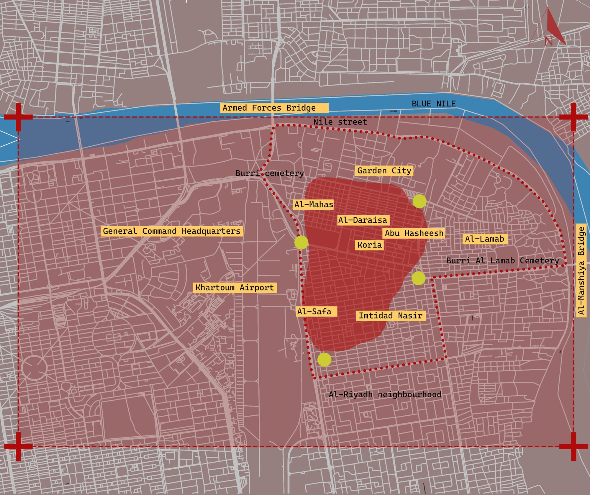 Nile Street is one of Khartoum’s most vital arteries. It runs parallel to the Blue Nile and connects the urban core to the bridges that link the three cities of the capital: Khartoum, Bahri and Omdurman. Its significance dates back to the British colonial period, when the governor’s palace and elite residences were first established along the river bank. Under Omar al-Bashir’s rule, the army further expanded its presence through new commercial investments and construction projects, including the Khartoum National Club, one of the army’s largest investments in the city. Once the RSF took control of Nile Street during the first two days of fighting, they were able to block all access in and out. For those trapped in Burri, the closure of this route disrupted the entry of essentials and cut evacuation paths.